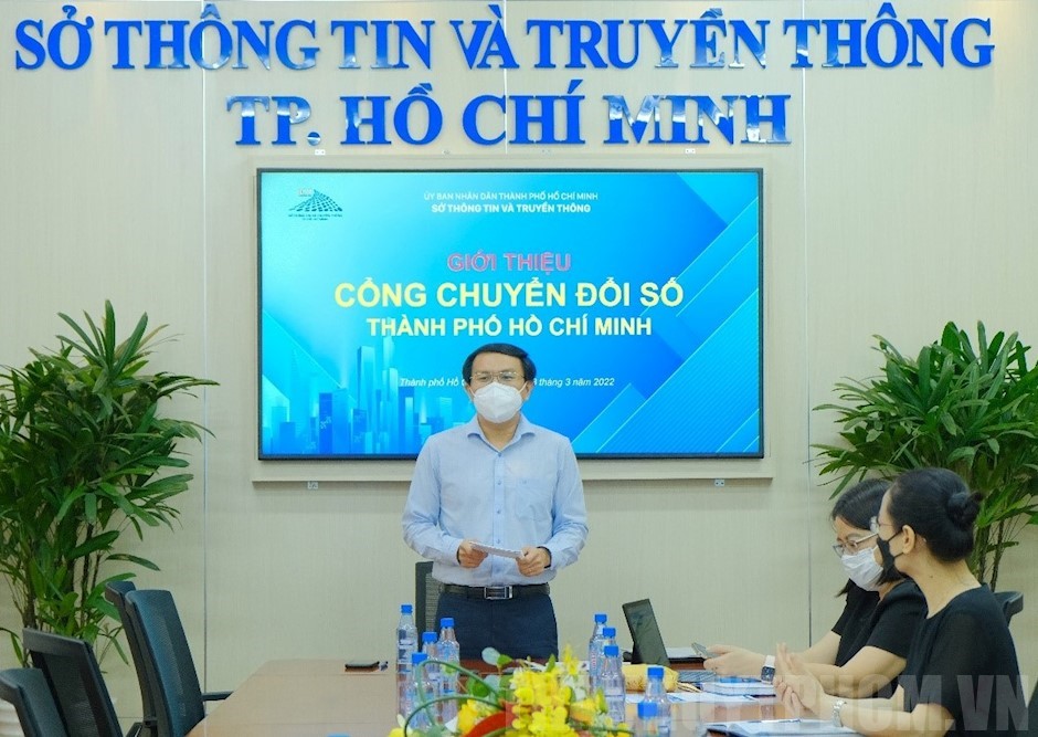 Giám đốc Sở Thông tin và Truyền thông TPHCM Lâm Đình Thắng giới thiệu Cổng chuyển đổi số TPHCM(Thanhuytphcm.vn) - Bộ Thông tin và Truyền thông đã công bố kết quả xếp hạng chỉ số chuyển đổi số DTI năm 2022. Theo báo cáo xếp hạng, TPHCM tiếp tục vươn lên xếp hạng thứ 2 toàn quốc.