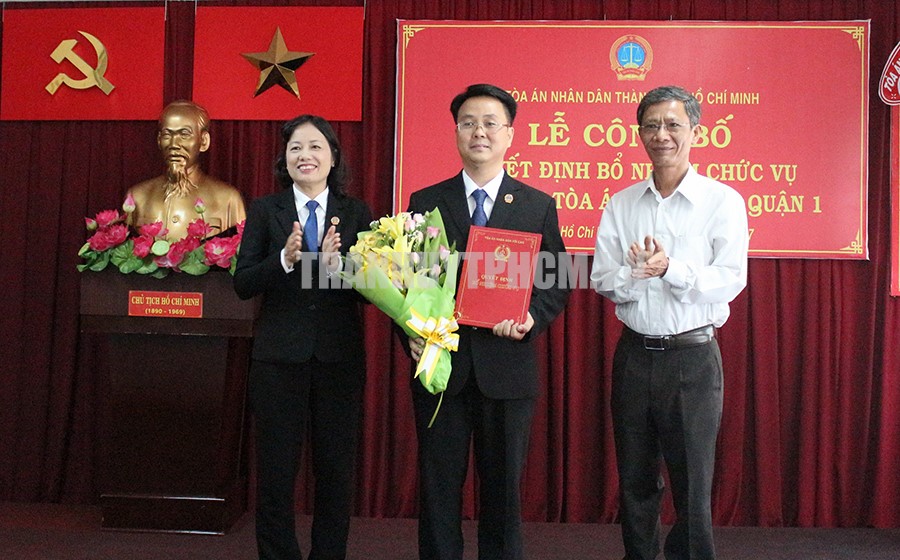 Chánh án Tòa án nhân dân TPHCM Ung Thị Xuân Hương (bìa trái) và Bí thư Quận ủy Quận 1 Huỳnh Thanh Hải (bìa phải) trao quyết định và tặng hoa chúc mừng Chánh án Tòa án nhân dân Quận 1 Nguyễn Thành Vinh.(Thanhuytphcm.vn) - Ngày 17/7, tại Tòa án nhân dân Quận 1, Tòa án nhân dân TPHCM công bố và trao quyết định bổ nhiệm chức vụ Chánh án Tòa án nhân dân Quận 1. Tham dự có các đồng chí: Ung Thị Xuân Hương, Thành ủy viên, Chánh án Tòa án nhân dân TPHCM; Huỳnh Thanh Hải, Thành ủy viên, Bí thư Quận ủy Quận 1; Phan Trọng Quyền, Phó Chủ tịch HĐND Quận 1.