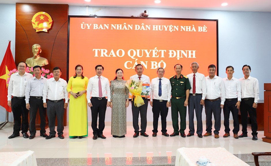 Các đồng chí lãnh đạo huyện và thị trấn Nhà Bè chụp hình lưu niệm cùng đồng chí Trần Thanh Luân(Thanhuytphcm.vn) - Sáng 9/10, UBND huyện Nhà Bè đã tổ chức trao Quyết định cán bộ. Tham dự trao Quyết định có các đồng chí: Triệu Đỗ Hồng Phước, Phó Bí thư Huyện ủy, Chủ tịch UBND huyện; Nguyễn Văn Trường, Ủy viên Ban Thường vụ Huyện ủy, Phó Chủ tịch HĐND huyện; Lê Thị Anh Thư, Ủy viên Ban Thường vụ Huyện ủy, Phó Chủ tịch UBND huyện; Võ Phan Lê Nguyễn, Ủy viên Ban Thường vụ Huyện ủy, Phó Chủ tịch UBND huyện.