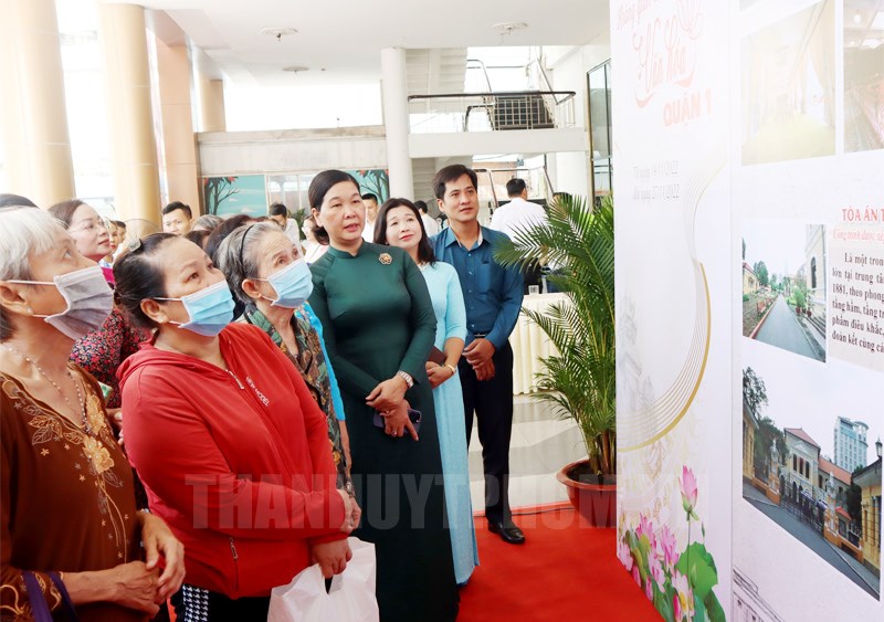 Các đại biểu tham quan triển lãm(Thanhuytphcm.vn) - Sáng 14/11, UBND Quận 1 phối hợp với Hội Di sản văn hóa TPHCM tổ chức triển lãm kỷ niệm Ngày Di sản văn hóa Việt Nam lần thứ XVII (23/11/2005 - 23/11/2022) với chủ đề “Không gian di sản văn hóa Quận 1”. Tham dự có các đồng chí: Hoàng Thị Tố Nga, Phó Bí thư Thường trực Quận ủy Quận 1; Mai Thị Hồng Hoa, Phó Chủ tịch UBND Quận 1; Nguyễn Trung Châu Tuyên, Trưởng Ban Tuyên giáo Quận ủy Quận 1; Đỗ Thị Ánh Tuyết, Trưởng Phòng Văn hóa và Thông tin Quận 1; Phan Ngọc Thảo, Giám đốc Trung tâm Văn hóa Quận 1;…