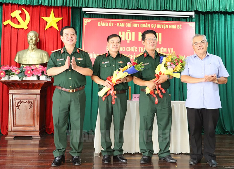 Thiếu tướng Phan Văn Xựng và đồng chí Phạm Minh Huấn trao hoa chúc mừng 2 đồng chí.(Thanhuytphcm.vn) - Chiều 22/7, Đảng ủy, Ban Chỉ huy Quân sự huyện Nhà Bè tổ chức Hội nghị bàn giao chức trách, nhiệm vụ Chính trị viên Ban Chỉ huy Quân sự huyện.