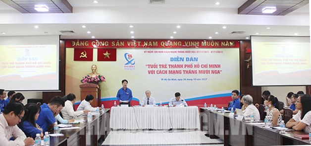 Diễn đàn “Tuổi trẻ TPHCM với Cách mạng Tháng Mười Nga”.(Thanhuytphcm.vn) - Ngày 26/10, Thành đoàn TPHCM đã tổ chức Diễn đàn “Tuổi trẻ TPHCM với Cách mạng Tháng Mười Nga” với mong muốn tăng cường nhận thức cho đoàn viên, thanh niên TP về tầm vóc và ý nghĩa to lớn của Cách mạng Tháng Mười Nga trong lịch sử nhân loại, cũng như sự vận dụng sáng tạo Chủ nghĩa Mác - Lênin làm nên thành công cho cách mạng Việt Nam, từ đó khẳng định lập trường, tư tưởng kiên định độc lập dân tộc gắn với chủ nghĩa xã hội.