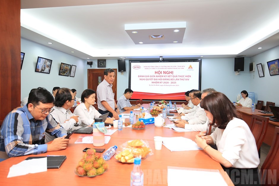Phó Bí thư Thường trực Đảng ủy Tổng Công ty Trương Văn Rón phát biểu chỉ đạo hội nghị(Thanhuytphcm.vn) - Chiều 9/6, Đảng bộ Công ty Cổ phần Việt Nam Kỹ nghệ Súc sản (Vissan) đơn vị trực thuộc Đảng bộ Tổng Công ty Thương mại Sài Gòn TNHH MTV (Satra) tổ chức hội nghị sơ kết giữa nhiệm kỳ thực hiện Nghị quyết Đại hội Đảng bộ Công ty lần thứ XIV, nhiệm kỳ 2020 - 2025. Đến dự, có các đồng chí: Trương Văn Rón, Phó Bí thư Thường trực Đảng ủy Tổng Công ty; Lâm Quốc Thanh, Phó Bí thư Đảng ủy, Tổng Giám đốc Tổng Công ty…
