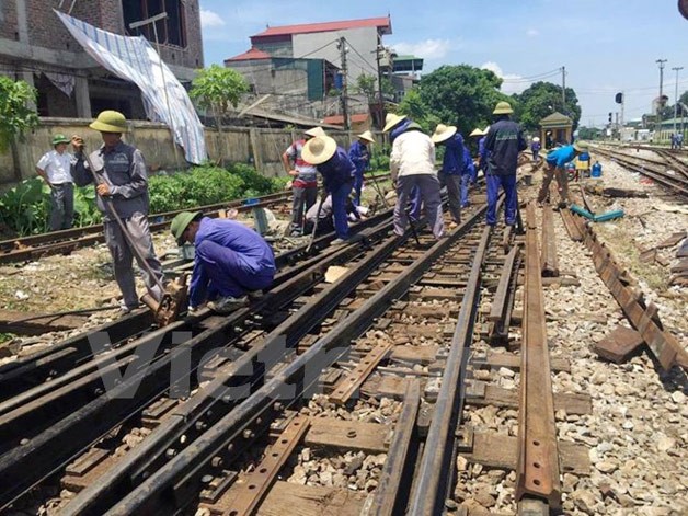 Công nhân ngành đường sắt đang tiến hành sửa chữa ghi cụm ghi tàu hỏa bị trật bánh. (Ảnh: Vietnam+)