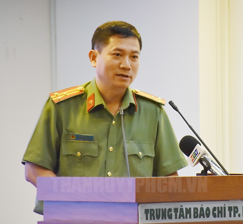 Thượng tá Lê Mạnh Hà thông tin tại buổi họp báo.(Thanhuytphcm.vn) - Tại buổi họp báo do UBND TP tổ chức chiều 23/2, Thượng tá Lê Mạnh Hà, Phó Trưởng Phòng Tham mưu Công an TP đã trao đổi một số thông tin về tình trạng lái xe sử dụng rượu bia gây tai nạn giao thông và hành vi chống người thi hành công vụ.