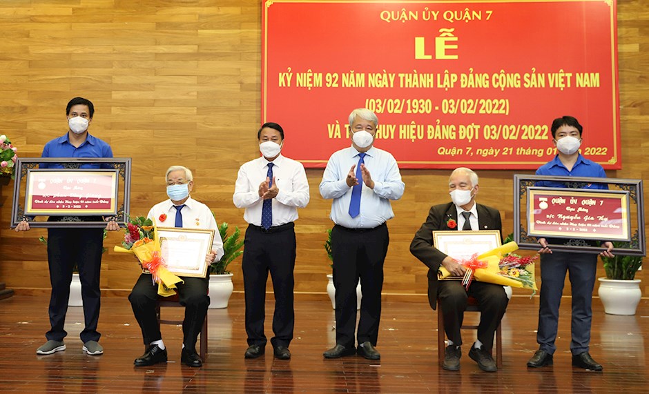 Các đồng chí lãnh đạo Quận 7 trao tặng Huy hiệu Đảng cho đảng viên cao tuổi Đảng(Thanhuytphcm.vn) - Sáng 21/1, Quận ủy Quận 7 đã long trọng tổ chức lễ kỷ niệm 92 năm Ngày thành lập Đảng Cộng sản Việt Nam (3/2/1930 – 3/2/2022) và trao Huy hiệu Đảng đợt 3/2 cho các đồng chí đảng viên cao tuổi Đảng. Đến tham dự có các đồng chí: Võ Khắc Thái, Bí thư Quận ủy; Trần Chí Dũng, Phó Bí thư Thường trực Quận ủy.