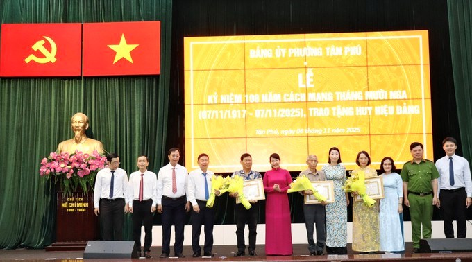 Sáng 6/11, Đảng ủy phường Tân Phú (TPHCM) tổ chức Lễ kỷ niệm 108 năm Cách mạng Tháng Mười Nga (7/11/1917 – 7/11/2025) và trao tặng Huy hiệu Đảng cho các đảng viên.