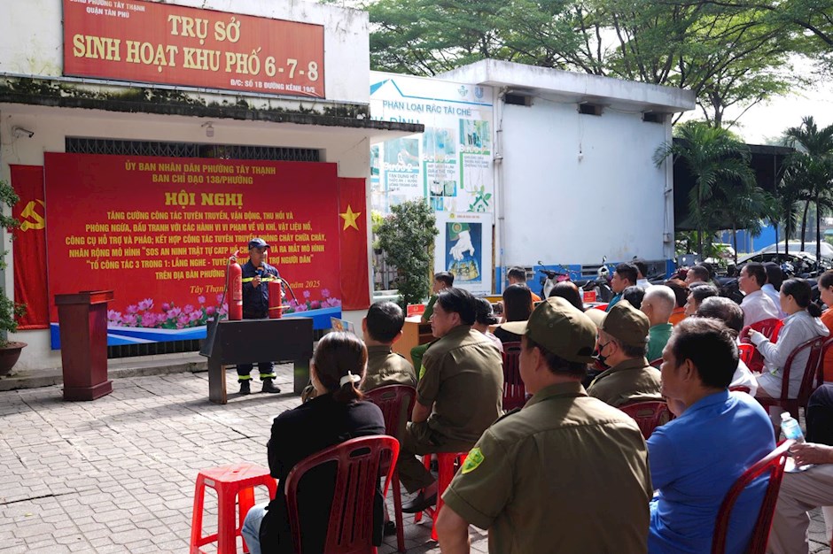 Sáng 16/10, Công an phường Tây Thạnh (TP Hồ Chí Minh) tham mưu Ban Chỉ đạo 138 địa phương tổ chức hội nghị tuyên truyền, vận động thu hồi, phòng ngừa và đấu tranh với các hành vi vi phạm pháp luật về vũ khí, vật liệu nổ, công cụ hỗ trợ và pháo; kết hợp tuyên truyền phòng cháy chữa cháy và ra mắt mô hình “Tổ công tác 3 trong 1: Lắng nghe - Tuyên truyền - Hỗ trợ người dân”.