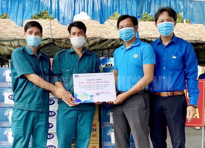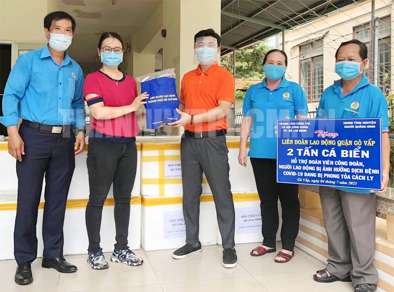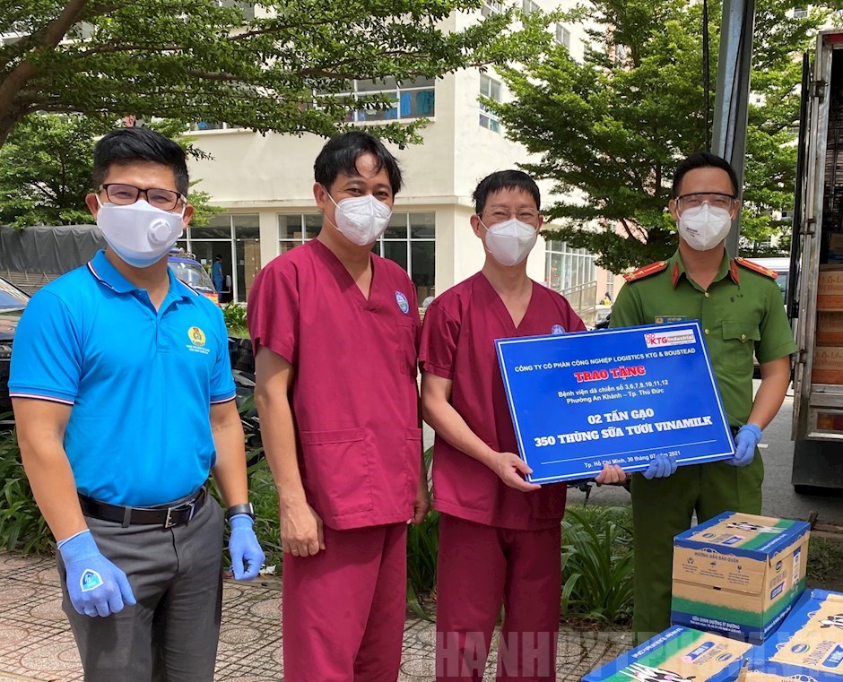 (Thanhuytphcm.vn) - Ngày 30/7, Trung tâm công tác xã hội công đoàn - Liên đoàn lao động TPHCM phối hợp Công ty cổ phần công nghiệp Logistics KTG & BOUSTEAD đã trao tặng cho lực lượng tuyến đầu chống dịch, đội ngũ y bác sĩ ở 7 bệnh viện dã chiến số 3, 6,7,8,10,11,12 trên địa bàn TP Thủ Đức gồm 4,5 tấn gạo, 450 thùng sữa và 100 thùng mì…