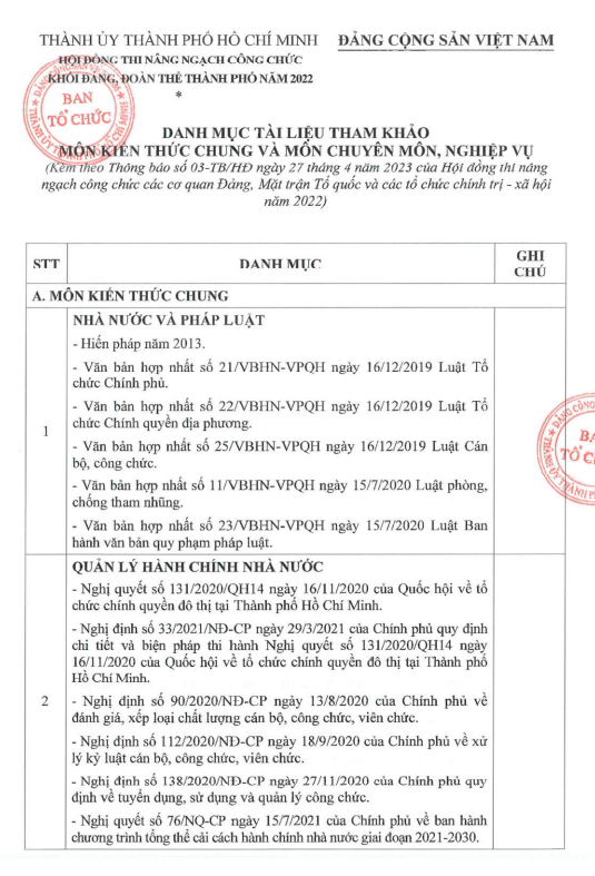 (Thanhuytphcm.vn) - Hội đồng thi nâng ngạch công chức khối Đảng, đoàn thể TPHCM năm 2022 vừa ra thông báo về danh mục tài liệu tham khảo phục vụ kỳ thi nâng ngạch công chức các cơ quan Đảng, Mặt trận Tổ quốc và các tổ chức chính trị - xã hội thành phố năm 2022.