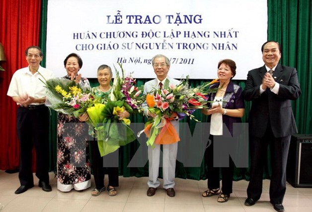 Năm 2011, Phó Chủ tịch nước Nguyễn Thị Doan trao Huân chương Độc lập hạng Nhất của Chủ tịch nước tặng Giáo sư Nguyễn Trọng Nhân (giữa)- nguyên Chủ tịch TW Hội Chữ thập Đỏ Việt Nam. (Ảnh: TTXVN)