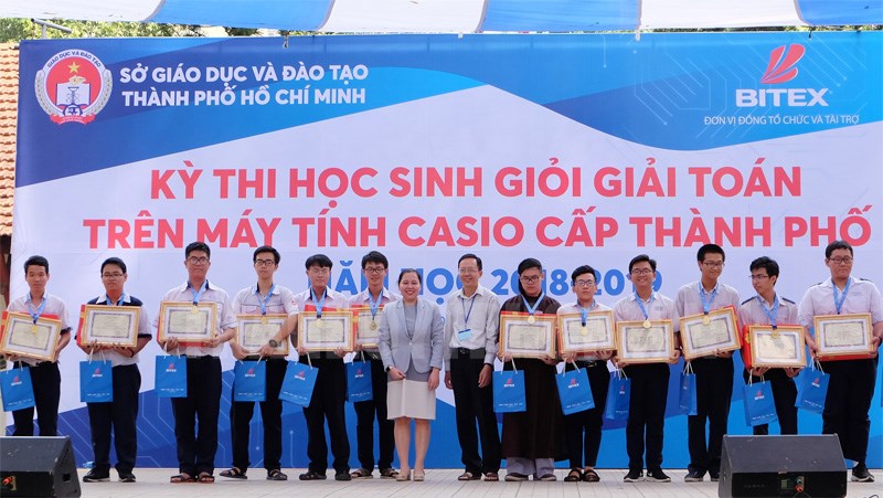 Đại diện Ban tổ chức trao thưởng cho các thí sinh đạt giải.(Thanhuytphcm.vn) - Ngày 20/1, tại Trường THPT Marie Curie, Sở Giáo dục - Đào tạo TPHCM phối hợp Công ty CP Xuất nhập khẩu Bình Tây (BITEX) tổ chức Kỳ thi Giải toán trên máy tính cầm tay Casio cấp TP các môn: toán học lớp 9; toán, vật lý, hóa học và sinh học lớp 12.