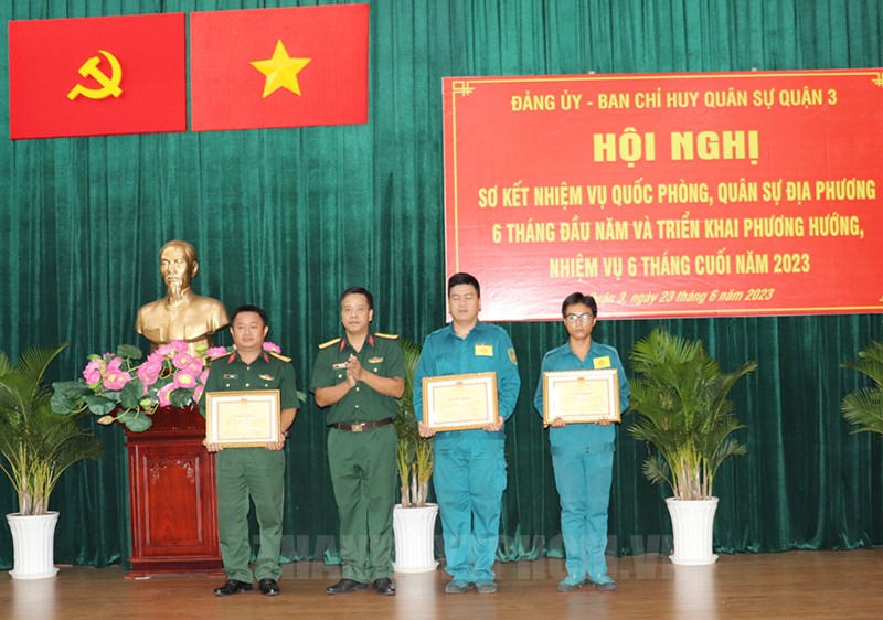 Ban CHQS Quận 3 trao thưởng cho các tập thể có thành tích xuất sắc trong phục vụ Hội thao Quốc phòng, thể dục thể thao lực lượng vũ trang Thành phố năm 2023.(Thanhuytphcm.vn) - Chiều 23/6, Đảng ủy, Ban Chỉ huy Quân sự (CHQS) Quận 3 tổ chức hội nghị sơ kết công tác quân sự, quốc phòng địa phương 6 tháng đầu năm 2023. Đồng chí Võ Văn Đức, Phó Bí thư Quận ủy, Chủ tịch UBND Quận 3 đến dự.