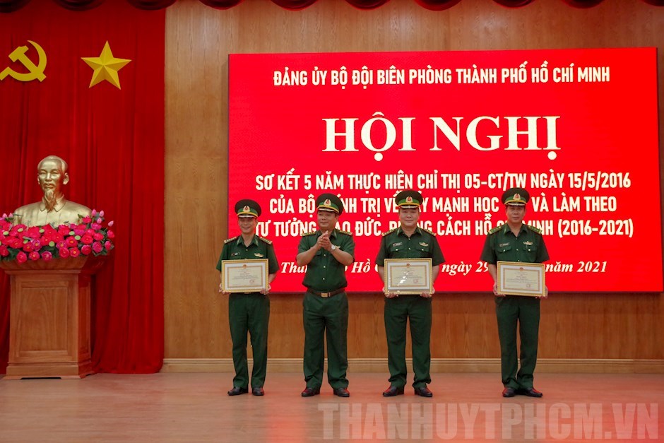 Đại tá Nguyễn Văn Tiến, Phó Chính ủy Bộ đội Biên phòng TPHCM trao tặng Giấy khen cho các tập thể, cá nhân có thành tích xuất sắc trong thực hiện Chỉ thị 05 của Bộ Chính trị, giai đoạn 2016-2021Đặc biệt, các cơ quan, đơn vị đã chủ động xây dựng kế hoạch làm theo nội dung tư tưởng, đạo đức, phong cách Hồ Chí Minh bằng nhiều mô hình sáng tạo, tiêu biểu, khẳng định quyết tâm cao của cán bộ, chiến sĩ BĐBP TP trong nâng cao chất lượng thực hiện nhiệm vụ như: Câu lạc bộ “Thanh niên bảo vệ chủ quyền biên giới biển”, Mô hình“Điểm sinh hoạt văn hóa cộng đồng”, “Lớp dạy nghề cho người dân xã đảo Thạnh An”, “Lớp học tình thương”, “Hũ gạo tình thương”, “Con nuôi đồn Biên phòng”; Chương trình “Bộ đội Biên phòng TPHCM chung sức xây dựng nông thôn mới”, “Chung tay vì người nghèo – Không để ai bị bỏ lại phía sau”, “Nâng bước em tới trường”, “Hãy làm sạch biển”…