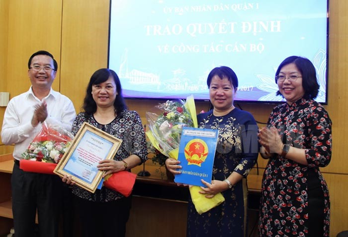 (Thanhuytphcm.vn) - Sáng 24/4, UBND Quận 1 tổ chức trao quyết định bổ nhiệm chức vụ Trưởng Phòng LĐ - TBXH Quận 1 cho đồng chí Phạm Thị Thu Giang, Phó Phòng LĐ - TBXH quận thay cho người tiền nhiệm nghỉ hưu. Thời hạn bổ nhiệm 5 năm và quyết định có hiệu lực từ ngày 1/5/2017.