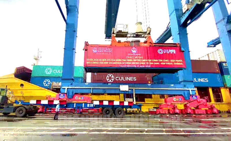 Container đầu tiên được vận chuyển lên tàu Hai Su 6(Thanhuytphcm.vn) - Chiều 3/6, Cảng Tân Cảng Hiệp Phước thuộc Tổng công ty Tân Cảng Sài Gòn đã đón tàu Hai Su 6, khai thác tuyến dịch vụ mới CV3 của hãng tàu China United Lines (CULines) lần đầu cập cảng khai thác độc lập, mở rộng chuỗi cung ứng kết nối Việt Nam và Trung Quốc.