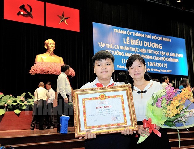 Tô Huỳnh Phúc và mẹ tại lễ tuyên dương Gương tiêu biểu học tập và làm theo tấm gương, đạo đức, phong cách Hồ Chí Minh của Thành ủy TPHCM.