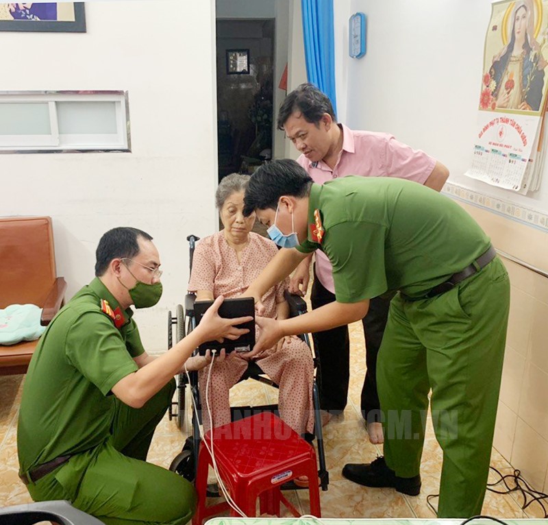 Các chiến sĩ công an tới tận nhà dân làm căn cước công dân cho người già.(Thanhuytphcm.vn) - Xác định việc hoàn thành cài đặt tài khoản định danh điện tử và đăng ký tài khoản định danh điện tử mức độ 2 cho Nhân dân đủ điều kiện là tiền đề, yếu tố then chốt trong việc triển khai thực hiện Đề án 06 của Chính phủ, thời gian qua, lực lượng Công an Quận 3 đã triển khai nhiều giải pháp đột phá, huy động được sự vào cuộc của cả hệ thống chính trị nhằm hướng tới “số hóa” định danh công dân trên toàn địa bàn.