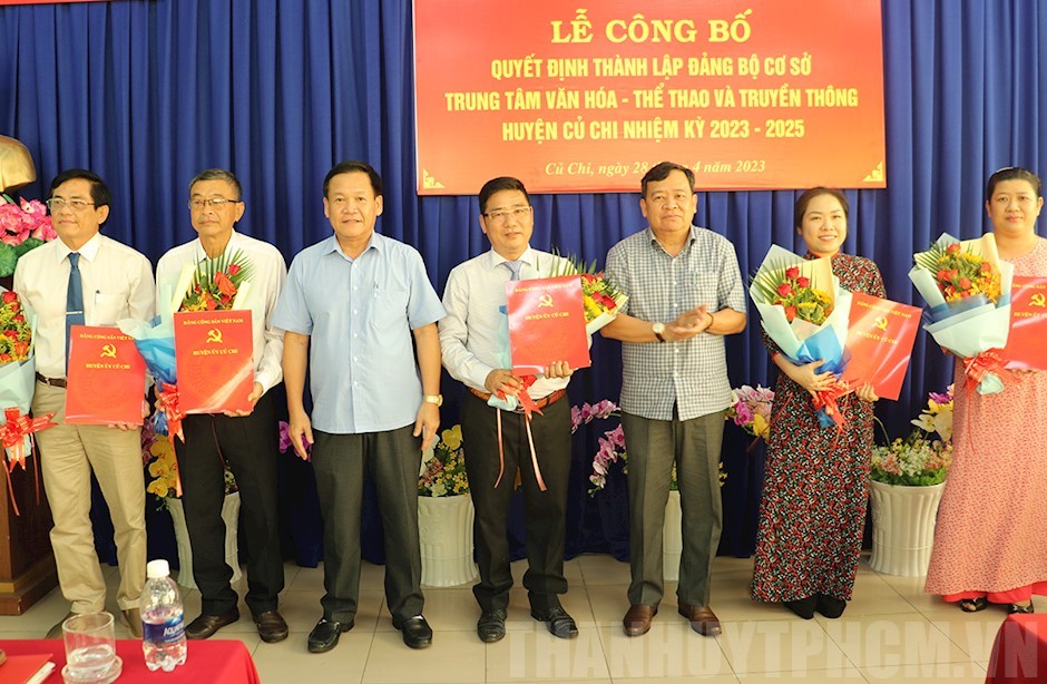 Lãnh đạo Ban Thường vụ Huyện ủy tặng hoa chúc mừng Ban Chấp hành Đảng bộ cơ sở Trung tâm Văn hóa – Thể thao và Truyền thông huyện Củ Chi(Thanhuytphcm.vn) - Ngày 28/4, Huyện ủy Củ Chi tổ chức Lễ công bố Quyết định thành lập Đảng bộ cơ sở Trung tâm Văn hóa - Thể thao và Truyền thông Huyện Củ Chi nhiệm kỳ 2023 - 2025.