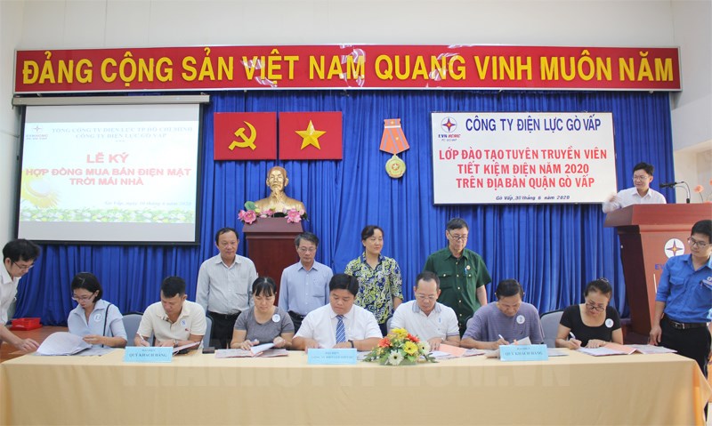 Tại buổi lễ, Công ty Điện lực quận Gò Vấp đã ký kết hợp đồng mua bán điện mặt trời mái nhà với 30 khách hàng đại diện cho hơn 402 khách hàng có lắp đặt hệ thống điện mặt trời trên mái nhà sau ngày 30/6/2019; đồng thời tổ chức khai mạc lớp đào tạo tuyên truyền viên tiết kiệm điện năm 2020 cho hơn 50 tuyên truyền viên đến từ các ban ngành, đoàn thể quận và 16 phường trên địa bàn quận Gò Vấp.