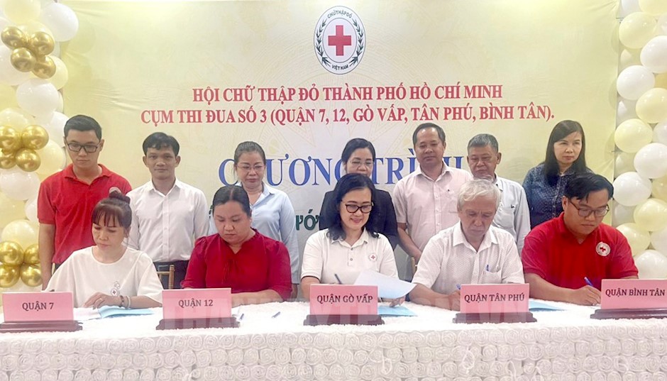 Các đồng chí lãnh đạo chứng kiến lễ ký giao ước thi đua năm 2023 giữa các đơn vị trong Cụm thi đua 3 Hội Chữ Thập đỏ TPHCM.(Thanhuytphcm.vn) - Sáng 4/4, tại quận Gò Vấp, Cụm thi đua 3 Hội Chữ Thập đỏ (CTĐ) TPHCM, gồm Hội Chữ thập đỏ quận Gò Vấp, Bình Tân, Tân Phú, Quận 7 và Quận 12 đã tổ chức Hội nghị ký kết giao ước thi đua năm 2023.