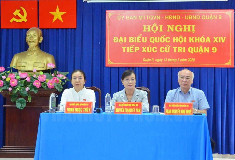 Các đại biểu Quốc hội tham dự buổi tiếp xúc cử tri.(Thanhuytphcm.vn) – Sáng 13/5, Tổ Đại biểu Quốc hội TPHCM đơn vị 7 gồm các đại biểu: Nguyễn Thị Quyết Tâm, nguyên Phó Bí thư Thành ủy, nguyên Chủ tịch HĐND TP; Phan Nguyễn Như Khuê, Ủy viên Ban Thường vụ Thành ủy, Trưởng Ban Tuyên giáo Thành ủy TPHCM; Trịnh Thị Ngọc Thúy, Phó Chánh án Tòa án Nhân dân TP đã có buổi tiếp xúc cử tri Quận 9 trước kỳ họp thứ 9, Quốc hội khóa XIV.