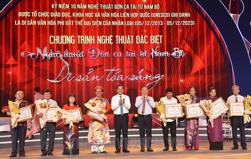 Đồng chí Phan Văn Mãi và đồng chí Dương Anh Đức trao Bằng khen cho các cá nhân.(Thanhuytphcm.vn) - Tối 8/12, Ban Tổ chức các ngày lễ lớn TPHCM tổ chức kỷ niệm 10 năm ngày UNESCO chính thức vinh danh loại hình nghệ thuật đờn ca tài tử vùng Nam bộ của Việt Nam vào danh sách di sản phi vật thể đại diện của nhân loại (5/12/2023 - 5/12/2023).