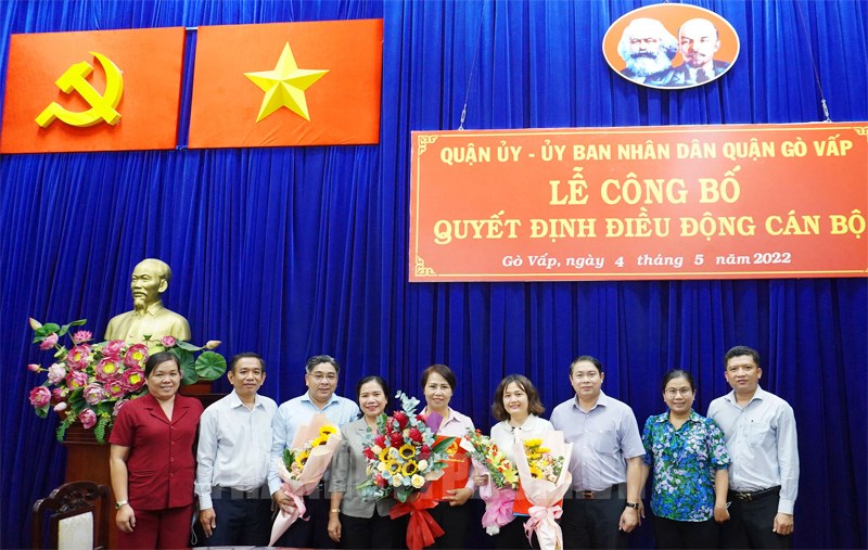 Lãnh đạo Quận ủy, UBND quận Gò Vấp trao quyết định và tặng hoa chúc mừng đồng chí nhận quyết định điều động, bổ nhiệm.(Thanhuytphcm.vn) - Chiều 4/5, Quận ủy, UBND quận Gò Vấp đã tổ chức Lễ công bố và trao quyết định cán bộ. Dự lễ có các đồng chí: Nguyễn Thị Thu Hoài, Phó Bí thư Thường trực Quận ủy; Nguyễn Trí Dũng, Phó Bí thư Quận ủy, Chủ tịch UBND quận; Nguyễn Thị Thu Hà, Trưởng Ban Tổ chức Quận ủy…