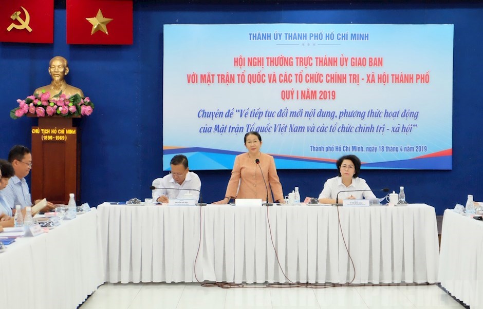 Phó Bí thư Thành ủy TPHCM Võ Thị Dung phát biểu tại hội nghị(Thanhuytphcm.vn) – Ngày 18/4, các đồng chí: Võ Thị Dung, Phó Bí thư Thành ủy TPHCM; Nguyễn Hữu Hiệp, Ủy viên Ban Thường vụ, Trưởng Ban Dân vận Thành ủy TP; Tô Thị Bích Châu, Ủy viên Ban Thường vụ Thành ủy, Chủ tịch Ủy ban MTTQ Việt Nam TPHCM đã chủ trì Hội nghị giao ban giữa Thường trực Thành ủy với MTTQ và các tổ chức chính trị - xã hội TP quý 1 năm 2019 với chuyên đề “Tiếp tục đổi mới nội dung, phương thức hoạt động của MTTQ Việt Nam và các tổ chức chính trị xã hội”.