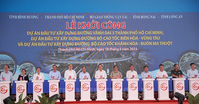 Thủ tướng Chính phủ Phạm Minh Chính cùng Bí thư Thành ủy Nguyễn Văn Nên tham quan sơ đồ dự án tại lễ khởi công.Tại điểm cầu tỉnh Đắk Lắk đến dự có Ủy viên Trung ương Đảng, Tổng Thư ký, Chủ nhiệm Văn phòng Quốc hội Bùi Văn Cường; Ủy viên Trung ương Đảng, Bộ Trưởng bộ Giao thông Vận tải Nguyễn Văn Thắng; Ủy viên Trung ương Đảng, Bí thư Tỉnh ủy tỉnh Đắk Lắk Nguyễn Đình Trung.