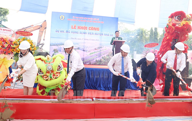 Các đồng chí lãnh đạo huyện Nhà Bè thực hiện nghi thức khởi công dự án mở rộng Bệnh viện huyện Nhà Bè.(Thanhuytphcm.vn) - Ngày 27/12, UBND huyện Nhà Bè đã tổ chức Lễ khởi công dự án mở rộng Bệnh viện huyện Nhà Bè. Đến dự có các đồng chí: Dương Thế Trung, Bí thư Huyện ủy Nhà Bè; Triệu Đỗ Hồng Phước, Phó Bí thư Huyện ủy, Chủ tịch UBND huyện Nhà Bè; Lê Thị Anh Thư, Ủy viên Ban Thường vụ Huyện ủy, Phó Chủ tịch UBND huyện Nhà Bè.