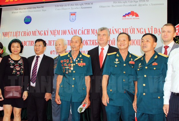 Các cựu lưu học sinh Việt Nam tại Liên Xô cũ chụp ảnh cùng các bạn Nga trong Lễ kỷ niệm 100 năm Cách mạng Tháng Mười Nga, tổ chức ngày 3/11, tại TPHCM. (Ảnh: Xuân Khu)