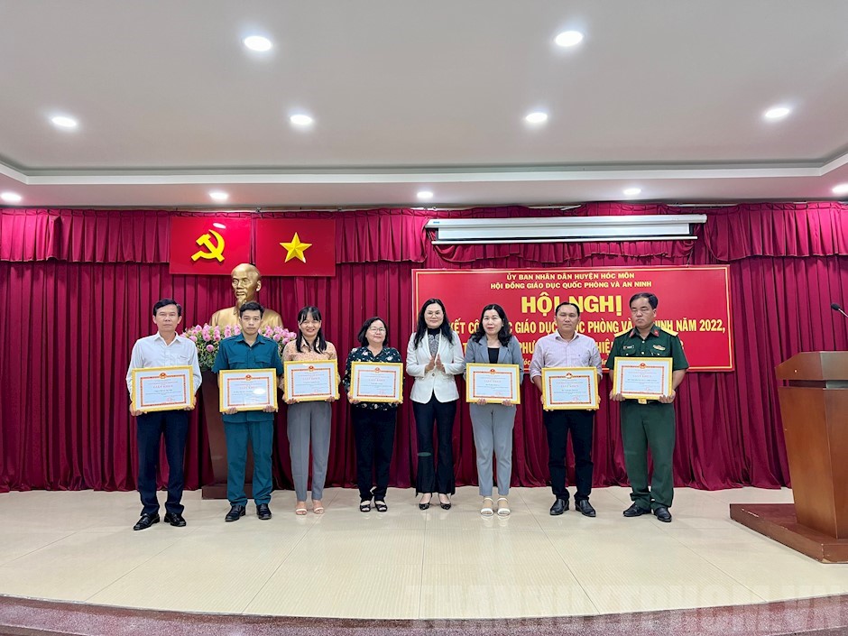 Đồng chí Lê Thụy Mỵ Châu trao giấy khen cho các tập thể(Thanhuytphcm.vn) - Chiều 22/2, Hội đồng giáo dục quốc phòng và an ninh huyện Hóc Môn (Hội đồng GDQP&AN) tổ chức Hội nghị tổng kết công tác giáo dục quốc phòng và an ninh năm 2022, triển khai phương hướng nhiệm vụ năm 2023.