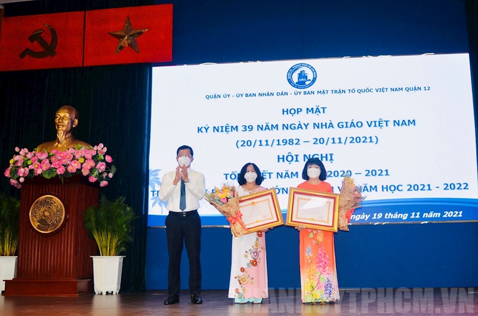 Bí thư Quận ủy Quận 12 Trần Hoàng Danh trao danh hiệu Nhà giáo ưu tú cho cô Lâm Ngọc Lệ (phải)(Thanhuytphcm.vn) - Hơn 30 năm gắn bó với sự nghiệp “trồng người”, cô giáo Lâm Ngọc Lệ (sinh năm 1967), Tổ trưởng Tổ Phổ thông Phòng Giáo dục và Đào tạo Quận 12 luôn được nhắc đến với hình ảnh một cô giáo tận tụy, tận tâm với nghề, hết lòng vì học sinh thân yêu.