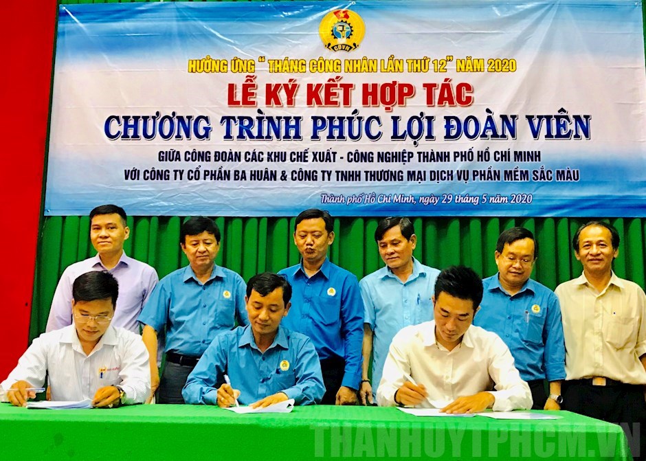 Các đơn vị thực hiện ký kết phối hợp chương trình phúc lợi đoàn viên 2020(Thanhuytphcm.vn) - Trưa 29/5, Công đoàn các Khu chế xuất và công nghiệp TP phối hợp Công ty TNHH Thương mại Dịch vụ Phần mềm Sắc Màu và Công ty cổ phần Ba Huân thực hiện ký kết Chương trình phúc lợi đoàn viên năm 2020. Đây cũng là chương trình hưởng ứng Tháng Công nhân lần thứ 12 năm 2020.