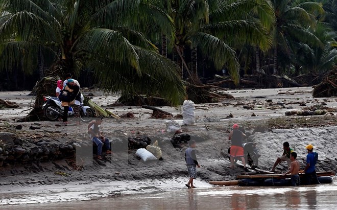 Người dân di chuyển bằng bè để qua sông sau bão Tembin tại tỉnh Lanao del Norte, Philippines ngày 23/12. (Nguồn: THX/TTXVN)