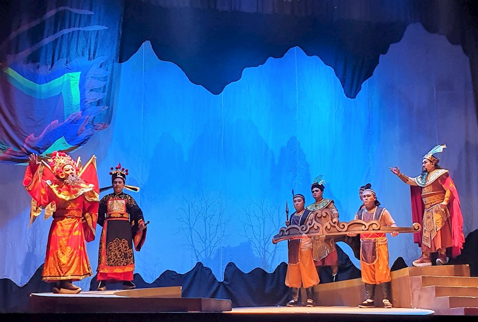 Nhà hát Nghệ thuật Hát bội TPHCM dựng vở Chiếc áo thiên nga chuẩn bị cho mùa hội diễn 2022(Thanhuytphcm.vn) - Chiều 27/1, Nhà hát Nghệ thuật Hát bội TPHCM tổ chức phúc khảo vở hát bội Chiếc áo thiên nga (kịch bản: Lê Duy Hạnh, chuyển thể hát bội: NSƯT Hữu Danh, đạo diễn: NSND Trần Ngọc Giàu) với sự tham gia biểu diễn của các diễn viên: NSƯT Linh Hiền (An Dương Vương), Bảo Châu (Trọng Thủy), Ngọc Giàu (Mỵ Châu), Kiều My (Hoàng Dung), Đông Hồ (Triệu Đà), Hoàng Hà (Cao Thục), Minh Khương (Nhan Tấn).