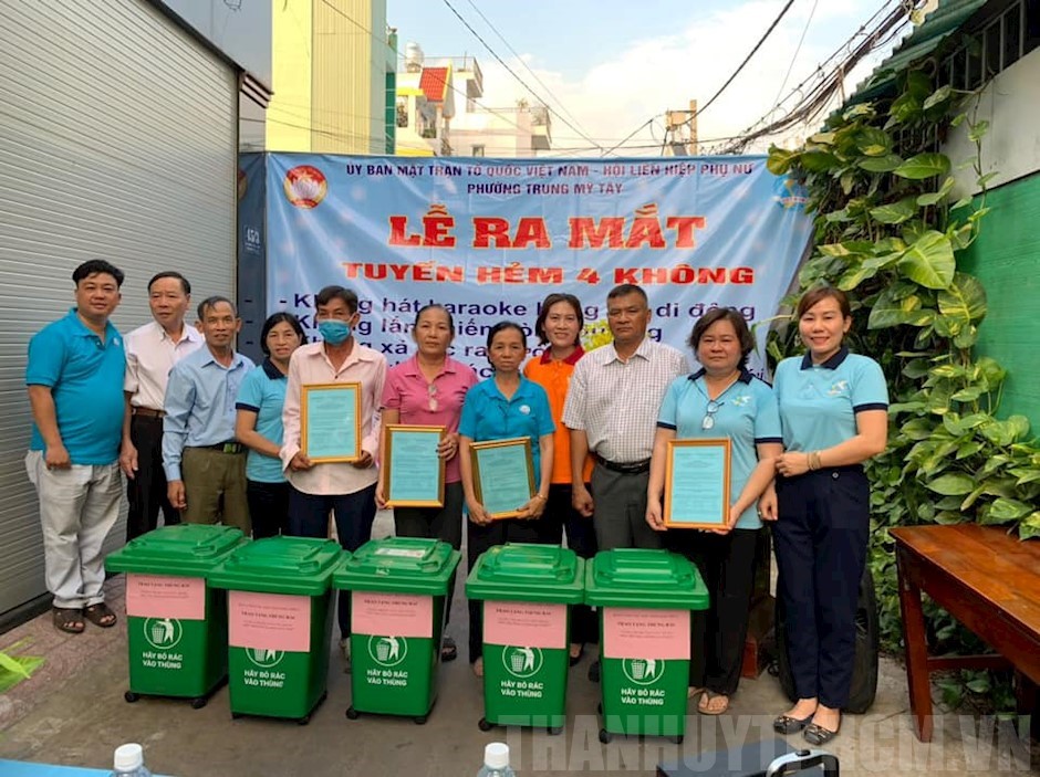 Ủy ban MTTQ Việt Nam phường ra mắt "Tuyến hẻm 4 không" và trao tặng thùng rác cho các hộ dân(Thanhuytphcm.vn) - Với mục đích tổ chức các hoạt động, các mô hình thực hiện hiệu quả Chỉ thị 19 của Ban Thường vụ Thành ủy về Cuộc vận động “Người dân Thành phố Hồ Chí Minh không xả rác ra đường và kênh rạch, vì Thành phố sạch, xanh và thân thiện môi trường”, trên địa bàn phường Trung Mỹ Tây, Quận 12 xuất hiện nhiều mô hình “Dân vận khéo” gắn với các hoạt động thiết thực, hiệu quả.