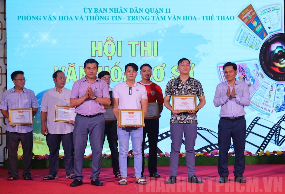 Các đồng chí lãnh đạo trao giấy khen cho các đơn vị đạt giải cao tại Hội thi(Thanhuytphcm.vn) – Ngày 2/10, Ban Chỉ đạo phong trào Toàn dân đoàn kết xây dựng đời sống văn hóa Quận 11 đã tổ chức hội thi tìm hiểu văn hóa cơ sở năm 2022 trên địa bàn Quận 11. Tham dự có các đồng chí: Nguyễn Hoàng Anh, Phó Trưởng phòng xây dựng nếp sống văn hóa, gia đình - Sở Văn hóa và Thể thao TPHCM; Trần Thị Bích Trâm, Phó Chủ tịch UBND quận.
