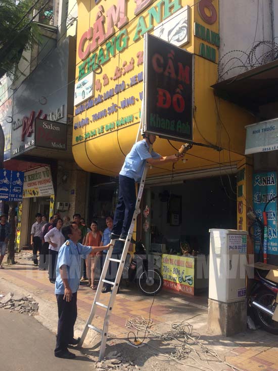 Lực lượng chức năng Quận 11 tháo dỡ bảng quảng cáo gắn sai quy định