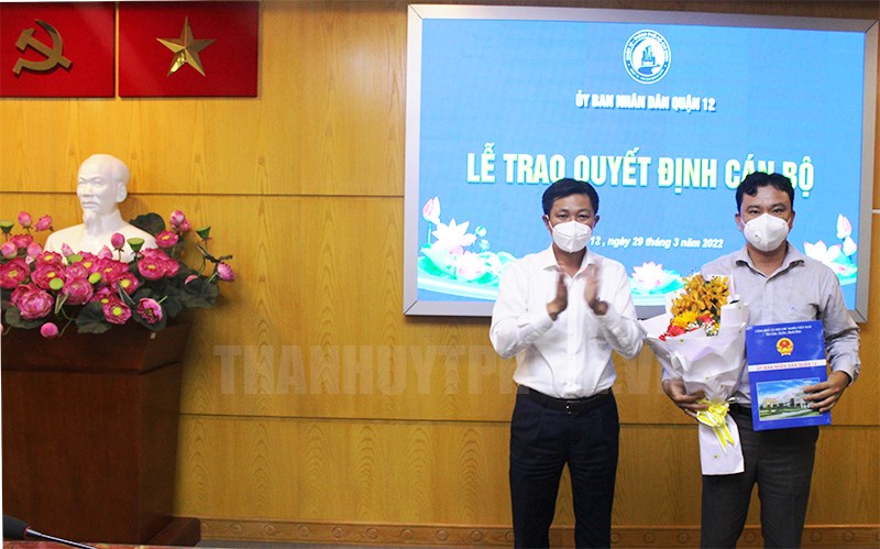 Đồng chí Nguyễn Văn Đức, Phó Bí thư Quận ủy, Chủ tịch UBND quận trao quyết định cho đồng chí Từ Nguyễn Đức Bằng.(Thanhuytphcm.vn) - Chiều 29/3, UBND Quận 12 tổ chức Lễ trao quyết định bổ nhiệm cán bộ. Đồng chí Nguyễn Văn Đức, Phó Bí thư Quận ủy, Chủ tịch UBND Quận 12 đến dự và phát biểu chỉ đạo, giao nhiệm vụ.