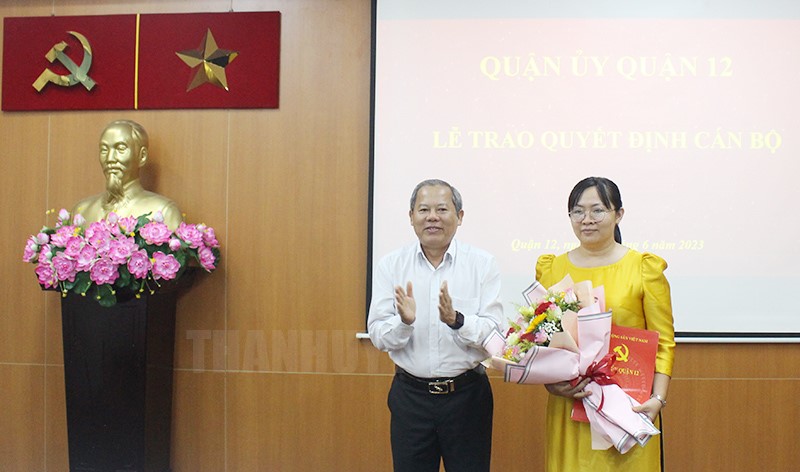 Lãnh đạo Quận ủy trao Quyết định và hoa chúc mừng cho đồng chí Nguyễn Thị Ngọc Quyên.(Thanhuytphcm.vn) - Sáng 19/6, Quận ủy Quận 12 đã tổ chức Lễ trao Quyết định cán bộ. Đến dự có đồng chí Trần Văn Út, Phó Bí thư Thường trực Quận ủy.