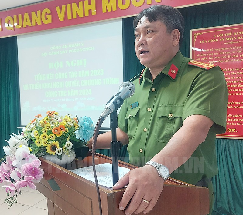 Phát biểu chỉ đạo tại hội nghị, Thượng tá Lê Quốc Bảo – Phó Trưởng Công an quận nhấn mạnh, trong năm 2023, lực lượng Cảnh sát PCCC&CNCH cần tập trung thực hiện nghiêm túc nhằm đáp ứng yêu cầu nhiệm vụ đảm bảo an toàn PCCC&CNCH trên địa bàn quận trong tình hình mới. Trong đó, nhiệm vụ trước mắt là trong dịp Tết Nguyên đán Giáp Thìn 2024, lực lượng Cảnh sát PCCC&NCH cần chủ trì, phối hợp với Công an 12 phường và các đội nghiệp vụ tiếp tục triển khai, thực hiện nghiêm túc đợt cao điểm tấn công, trấn áp tội phạm, bảo đảm an ninh, an toàn Tết Nguyên đán Giáp Thìn 2024 và Kế hoạch về tăng cường công tác PCCC& CNCH mùa hanh khô và Nguyên đán Giáp Thìn 2024 để hạn chế đến mức thấp nhất các vụ cháy nổ xảy ra trên địa bàn, góp phần đảm bảo cho nhân dân Quận 3 được đón Tết an toàn và bình yên.