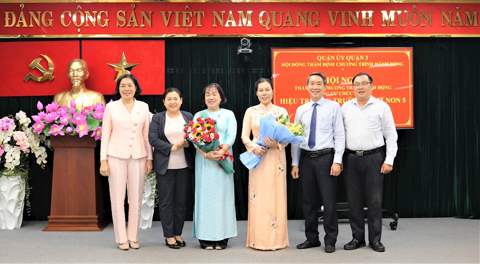 Hội đồng thẩm định tặng hoa chúc mừng 2 ứng viên(Thanhuytphcm.vn) - Sáng 4/4, Quận ủy Quận 3 tổ chức hội nghị thẩm định chương trình hành động của 2 đồng chí ứng cử chức danh Hiệu trưởng trường Mầm non 5. Tham dự có các đồng chí: Lương Thị Hồng Điệp, Trưởng phòng Giáo dục Mầm non Sở Giáo dục và Đào tạo TPHCM; Vũ Thị Mỹ Ngọc, Phó Chủ tịch UBND Quận 3, Chủ tịch Hội đồng thẩm định; Nguyễn Đình Phát, Trưởng Ban tổ chức Quận ủy; Phạm Đăng Khoa, Trưởng phòng Giáo dục và Đào tạo quận…