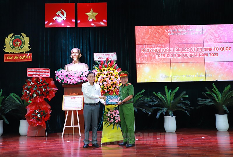 Đồng chí Lê Văn Chiến, Chủ tịch UBND Quận 4 tặng hoa, quà chúc mừng Ngày hội.(Thanhuytphcm.vn) - Chiều 18/8, Ban Chỉ đạo 138 (Ban Chỉ đạo phòng, chống tội phạm, tệ nạn xã hội và xây dựng phong trào Toàn dân bảo vệ an ninh Tổ quốc) Quận 4 tổ chức Ngày hội Toàn dân bảo vệ an ninh Tổ quốc năm 2023. Đến dự có đồng chí Lê Văn Chiến, Chủ tịch UBND Quận 4.