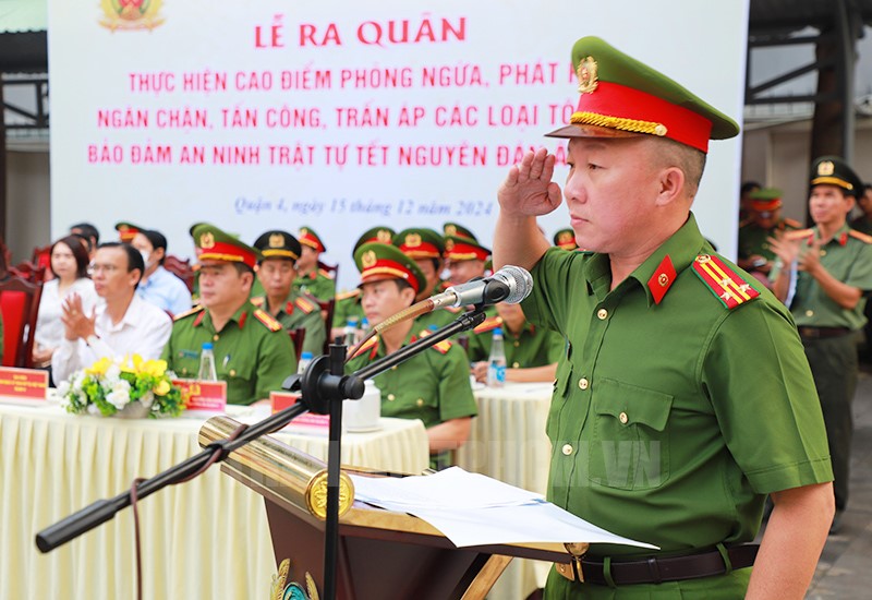 Thượng tá Phan Thanh Bình quán triệt tinh thần ra quân cho lực lượng cán bộ, chiến sĩ.(Thanhuytphcm.vn) - Sáng 15/12, Công an Quận 4 tổ chức Lễ ra quân thực hiện cao điểm phòng ngừa, phát hiện, ngăn chặn, tấn công, trấn áp các loại tội phạm, bảo đảm an ninh trật tự Tết Nguyên đán Ất Tỵ 2025. Dự lễ có các đồng chí: Nguyễn Thùy Trinh, Trưởng Ban Dân vận Quận ủy; Trần Thị Thanh Thảo, Trưởng Ban Tuyên giáo Quận ủy; Thượng tá Phan Thanh Bình, Trưởng Công an Quận 4.