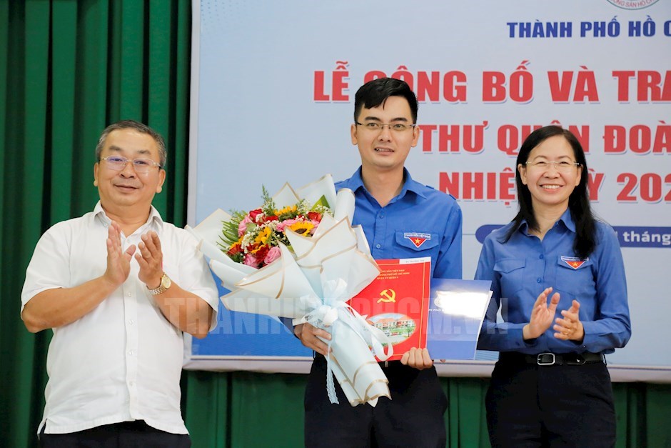 Đồng chí Phan Thị Thanh Phương và đồng chí Võ Ngọc Quốc Thuận trao quyết định cho đồng chí Mai Hữu Tâm(Thanhuytphcm.vn) - Ngày 1/12, Ban Thường vụ Thành đoàn tổ chức Lễ công bố và trao quyết định Bí thư Quận Đoàn Quận 8.