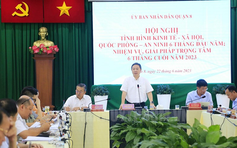 Đồng chí Dương Anh Đức phát biểu tại Hội nghị.(Thanhuytphcm.vn) - Chiều 22/6, UBND Quận 8 tổ chức Hội nghị tình hình kinh tế - xã hội, quốc phòng - an ninh 6 tháng đầu năm; nhiệm vụ, giải pháp trọng tâm 6 tháng cuối năm 2023.