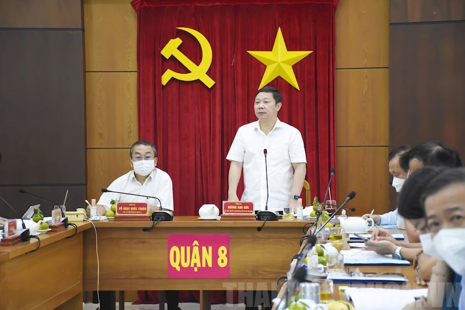 Đồng chí Trần Thanh Tùng báo cáo với đoàn công tácKết luận tại buổi làm việc, Phó Chủ tịch UBND TP Dương Anh Đức ghi nhận những nỗ lực của Quận 8 đạt được trong thời gian qua, dù dịch bệnh khó khăn nhưng đã thực hiện tốt nhiệm vụ, triển khai hiệu quả các giải pháp, hoàn thành các chỉ tiêu đề ra. Đồng chí thống nhất với các chỉ tiêu mà Quận đề ra trong năm 2022. Đối với những kiến nghị, đồng chí yêu cầu Quận chủ động, bám sát và phối hợp chặt chẽ với các sở, ban, ngành chuyên môn để tháo gỡ khó khăn, kịp thời giải quyết các vấn đề còn tồn tại; tập trung thực hiện hiệu quả các chỉ tiêu, đề án đã đề ra.
