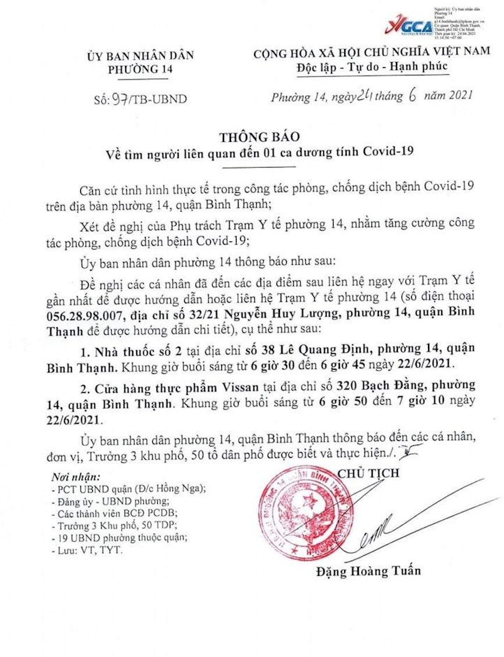 Theo đó, UBND Phường 14 đề nghị các cá nhân đã từng đến Nhà thuốc số 2 tại địa chỉ số 38 Lê Quang Định (khung giờ buổi sáng từ 6 giờ 30 đến 6 giờ 45 ngày 22/6/2021) và cửa hàng thực phẩm Vissan tại địa chỉ số 320 Bạch Đằng (khung giờ buổi sáng từ 6 giờ 50 đến 7 giờ 10 ngày 22/6/2021) trên địa bàn Phường 14.